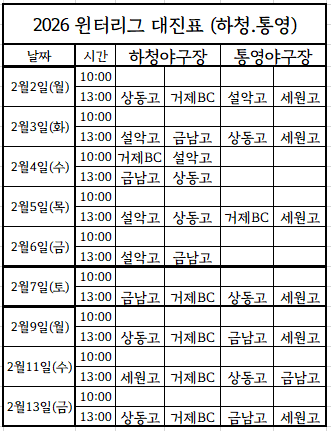 2026시즌 윈터리그 스토브리그 지역 대진표 (업데이트 요망)